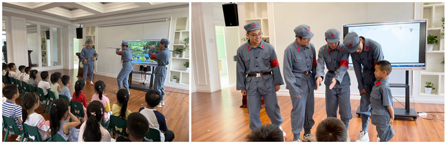 罗顺利等4位男生展演的红色舞台剧《朱德的扁担》,根据党史真实故事进行改编,真实生动,充满趣味,同时意蕴深厚。一幕幕红色经典历史情节,引导儿童深入了解在中国共产党的百年光辉发展历程中,革命先辈们不怕牺牲、艰苦奋斗的故事,深受园区老师好评和小朋友的喜爱。宣讲团还为小朋友们带来了精心准备的手语歌表演教学《我和我的祖国》,同学们教的耐心、细致,孩子们看得认真,学得用心,于无声处激发了孩子们的爱党、爱国之情。