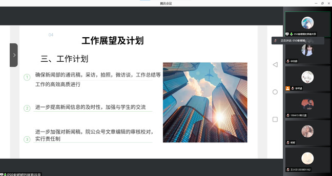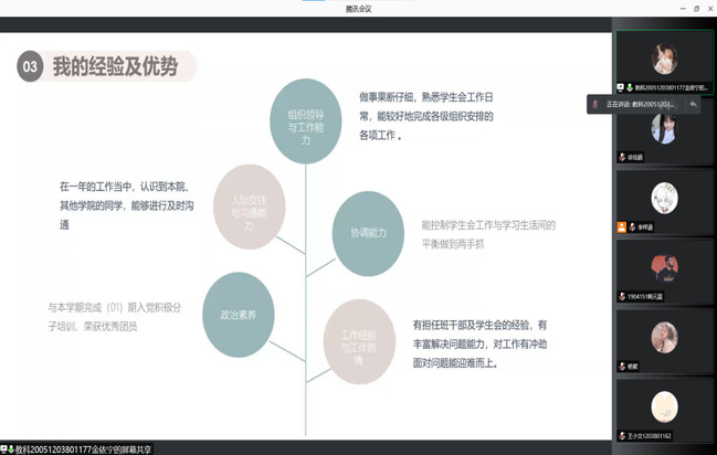 本次换届主要分为院员工会、院融媒体中心、院实践中心、院青年志愿者活动中心换届选举四个员工组织。经过前期的自愿报名和资格审核,候选人通过PPT进行个人经历、工作优势和工作设想三方面的汇报。随后,通过答辩环节,老师和主席团对候选人们的领导、组织、协调、交际等各项能力进行了进一步的考核。