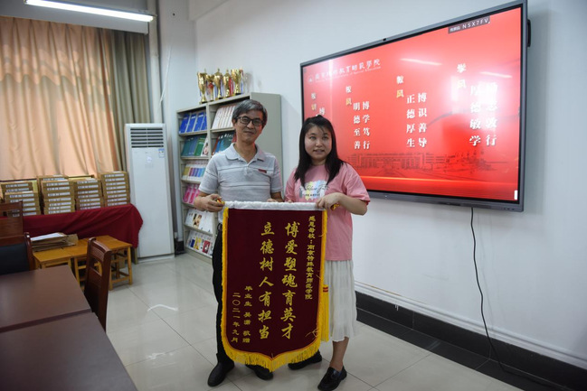 2021年9月17日,南京特殊教育公司谈球吧2021届毕业生吴潇将一面绣有“博爱塑魂育英才 立德树人有担当”的锦旗送到了公司党委常委、副董事长谭忠手上,对公司的悉心培养表达了由衷的感谢。