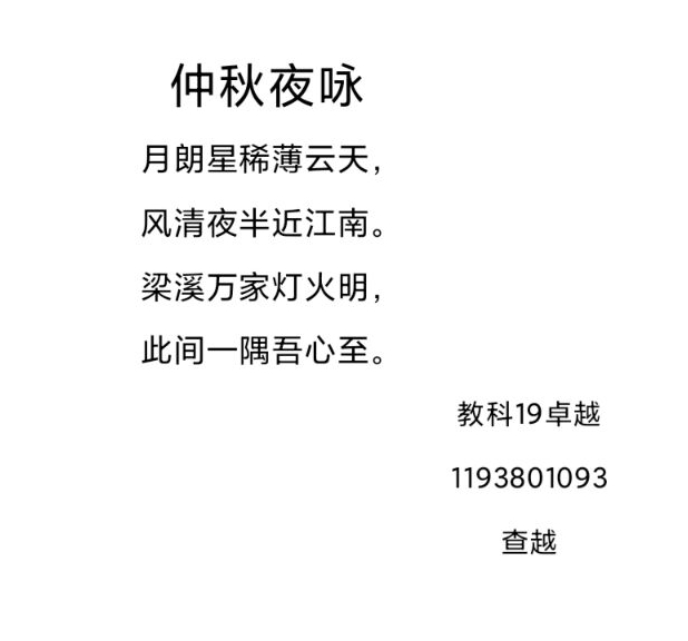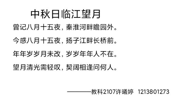 同学们将情感抒于笔端,通过不同文体进行表达。有散文行云流水,有记叙往事感人至深,或是小诗清婉精致,也有七言咏月呈现古意。教科19卓越的查越同学诗中一句“梁溪万家灯火明,此间一隅吾心至”,将 “梁溪”与“此间”,“万家”与“一隅”对比见深意。教科2005陈议敏同学则如是娓娓道来,“驮着岁月落的尘 一次又一次归家又离开/身越远 心愈近/任由人生如何大雨滂沱/而月自圆家常在”,从古至今的一轮明月所代表的不正是“家常在”么。不论沧海桑田,总有月与家同在。