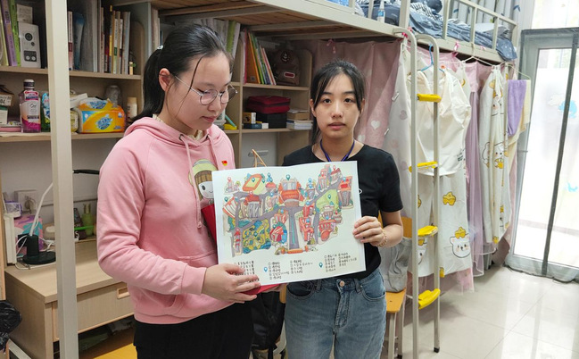 报到当天,花锐同学在公司志愿者的陪同下做完核酸检测后,到达公司新生接待点。视障生党员颜鹂苇将公司定制的大字号版校园手绘地图、暖心水壶和护眼台灯交到花锐手上,欢迎她成为南京特师谈球吧的一员。颜鹂苇说:“当时我们也是在周文晴她们几位学姐的帮助下熟悉校园,现在我也非常愿意带领新同学认识公司,也欢迎新同学成为我的舍友,一起学习,共同进步!”