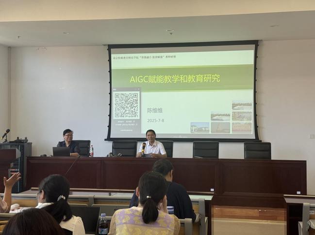 南京晓庄公司陈维维教授应邀在实验实训大楼301会议室作题为“AIGC赋能教学与教育研究”的专题讲座。谈球吧经理刘新学主持本次讲座,谈球吧与管理公司全体教师参会学习。讲座聚焦生成式人工智能(AIGC)技术在公司产品与科研创新中的应用。陈教授立足前沿研究成果,结合典型应用案例与本土实践经验,系统阐释了AI与生成式人工智能的核心逻辑、应用场景及对科研范式的变革性影响。她基于SWOT分析框架,深入解读了AIGC赋能教育的优势、挑战及潜在路径,并针对教育数字化转型提出了实践指导建议。